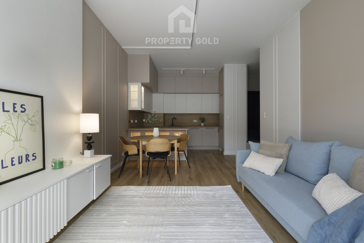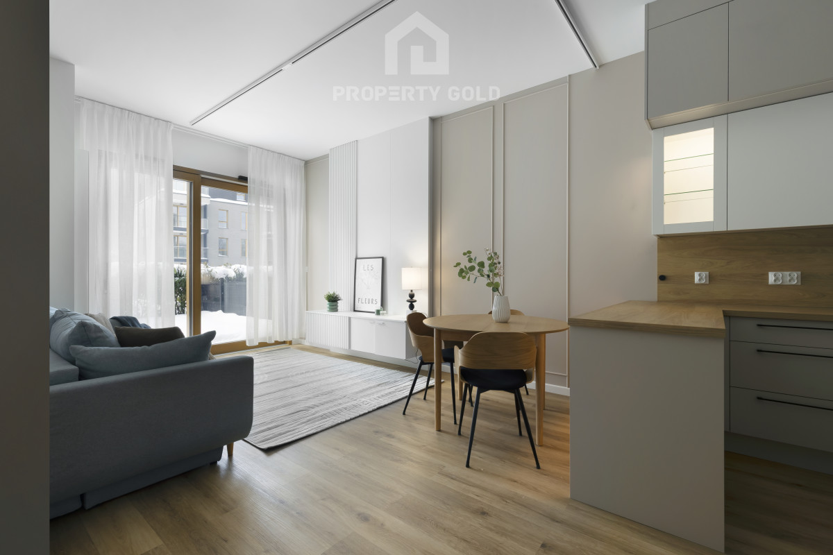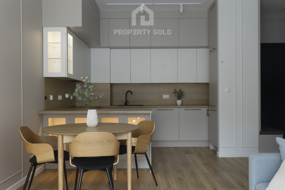Mieszkanie jest w pełni umeblowane i wyposażone, wykończone w wysokim standardzie z użyciem materiałów premium. Gotowe do zamieszkania od zaraz - bez konieczności dodatkowych inwestycji.