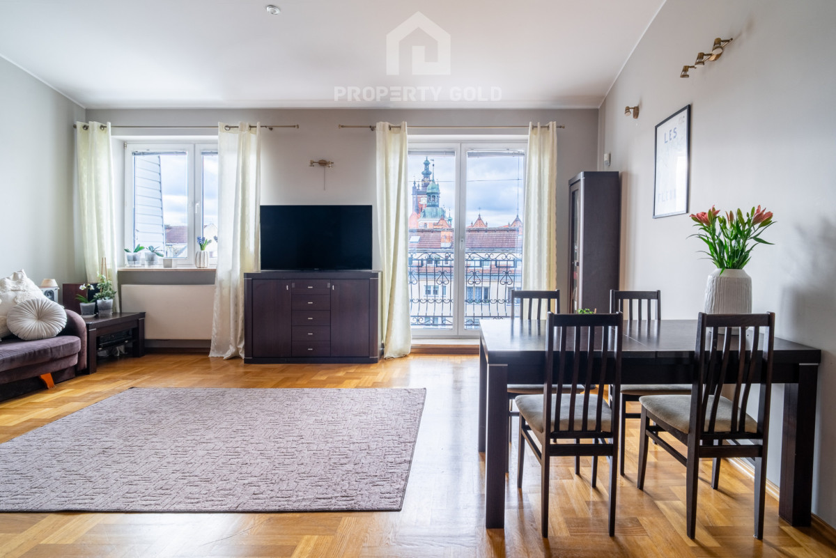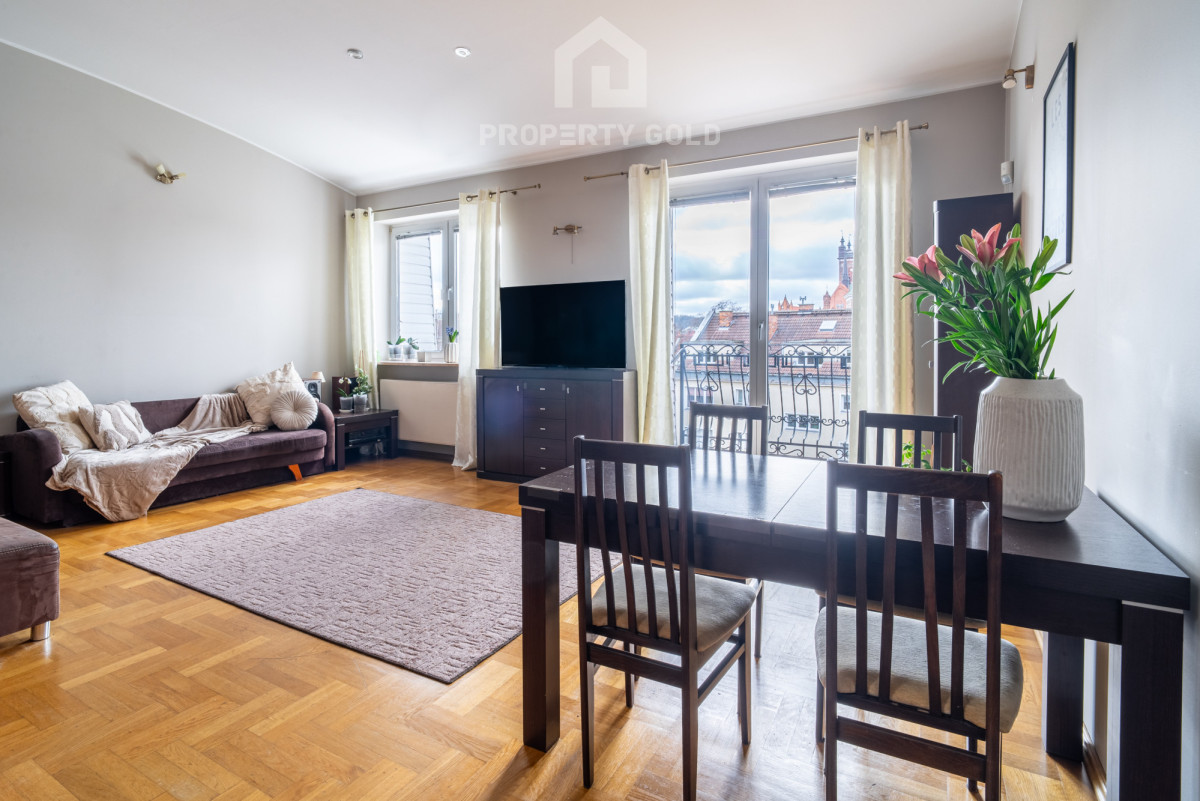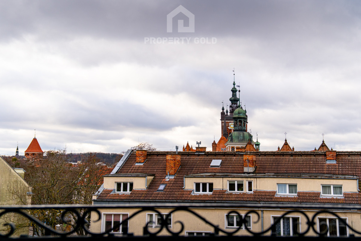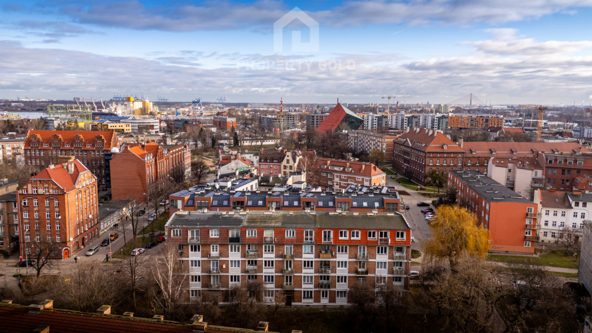 Apartament ma duże przestronne okna i balkon, z których rozciąga się niesamowity widok na dachy zabytkowych kościołów ( św. Brygidy, św. Katarzyny oraz Bazylikę Mariacką), a także na stocznię Gdańską i jej charakterystyczne dźwigi.