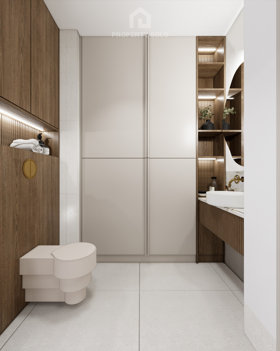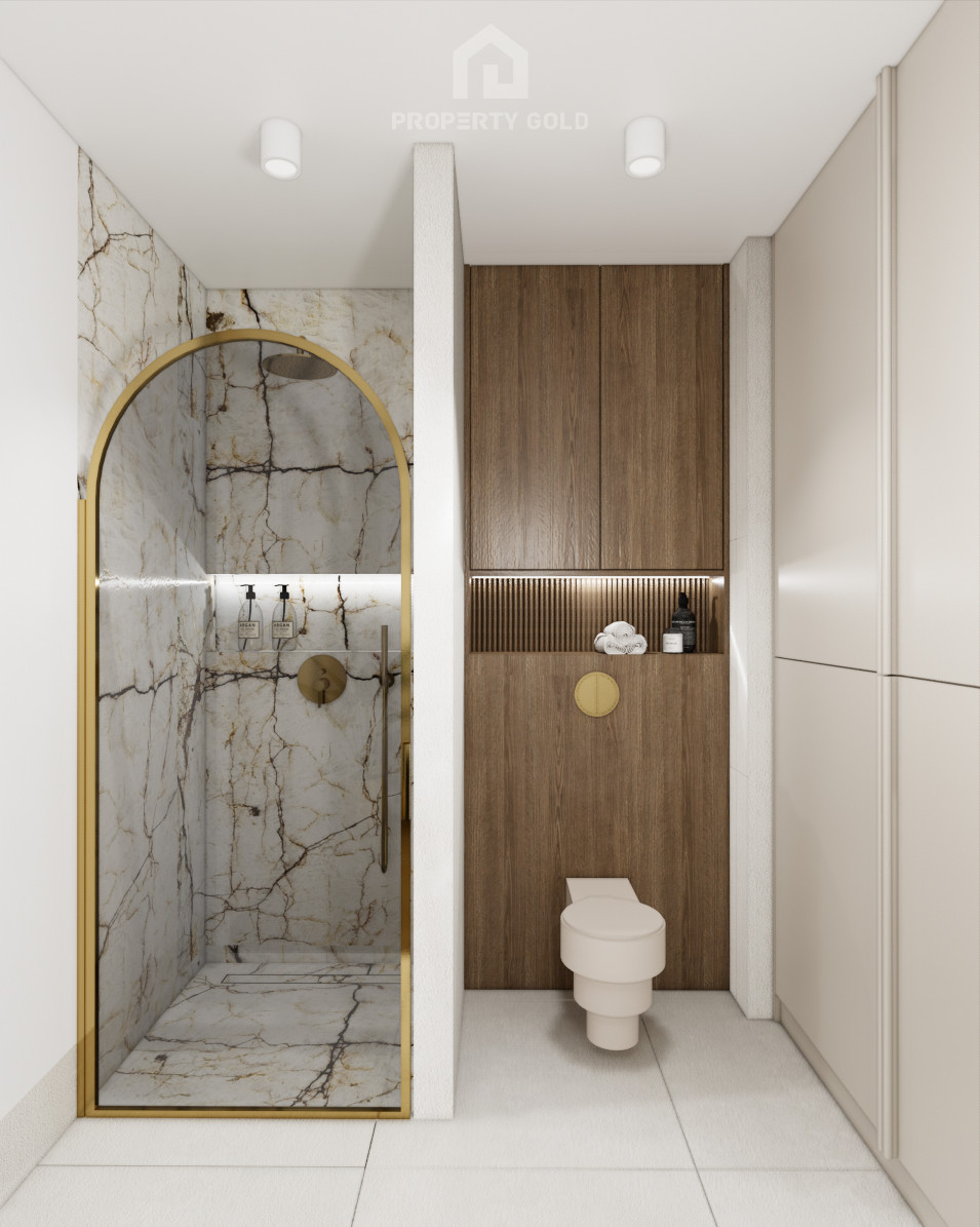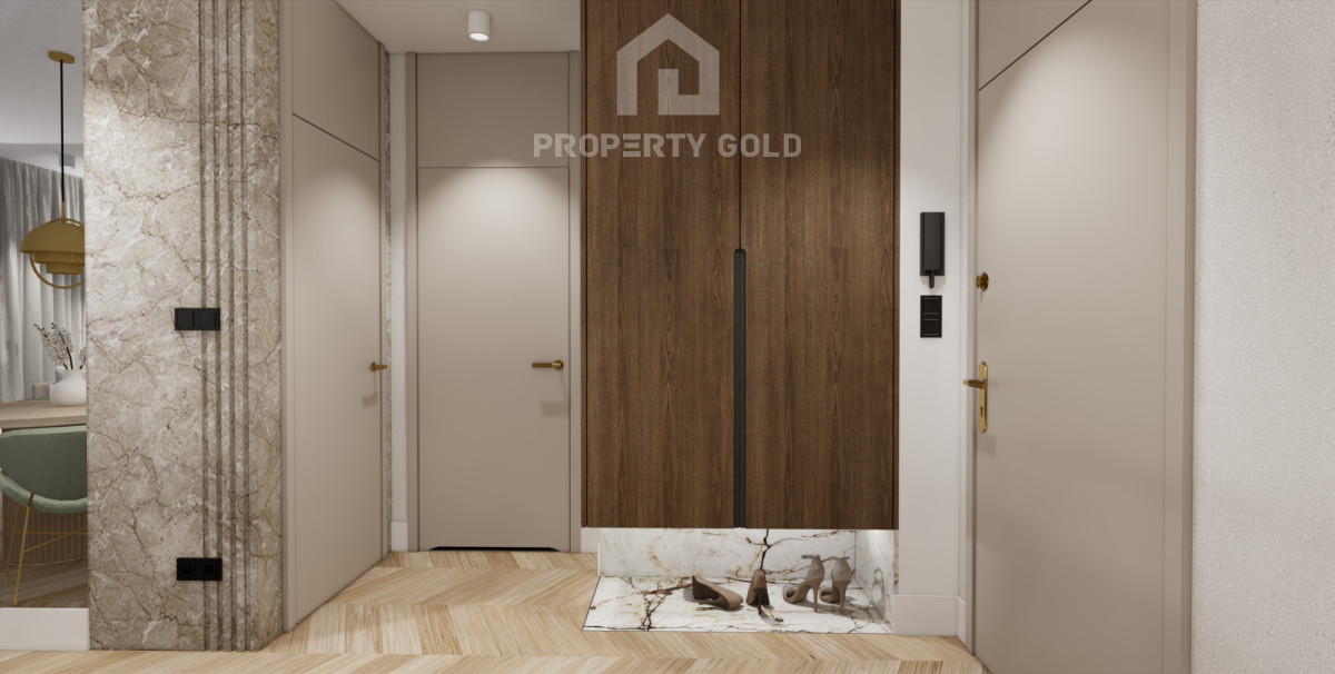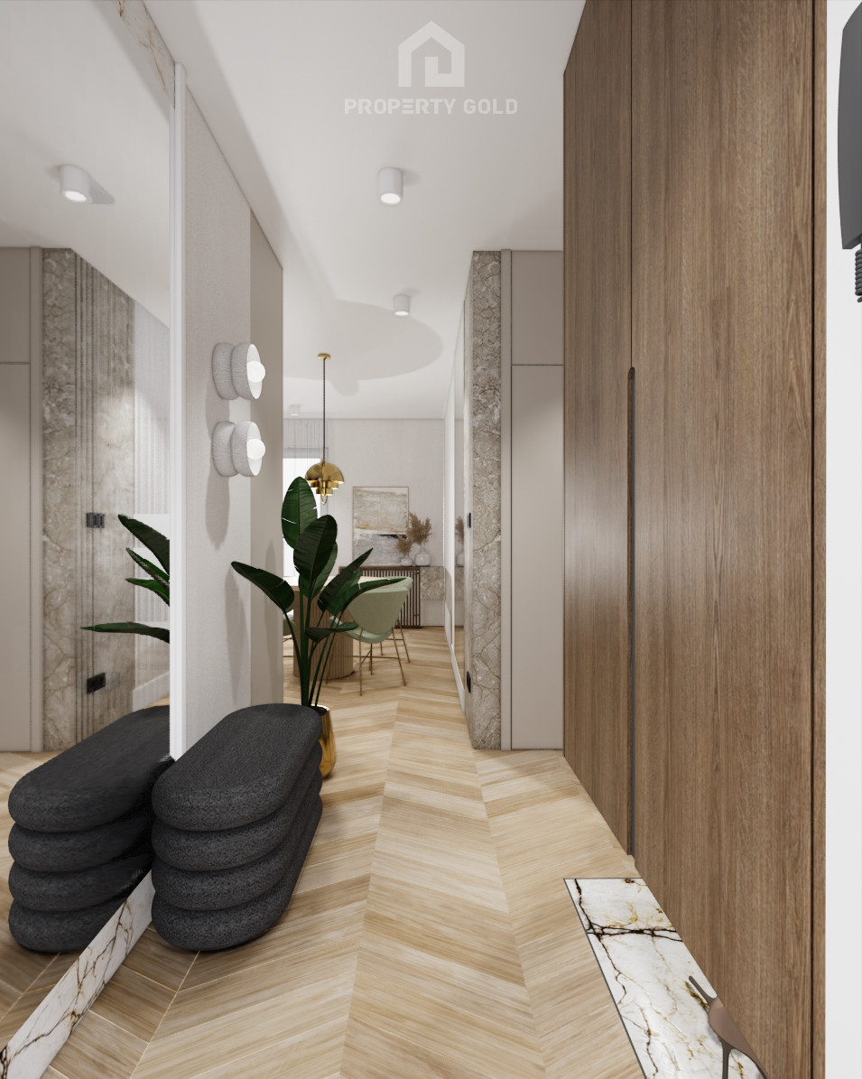 Całość jest bardzo stylowa, utrzymana w beżowej kolorystyce z wykorzystaniem wysokiej jakości materiałów takich jak kamień i piękne drewno.