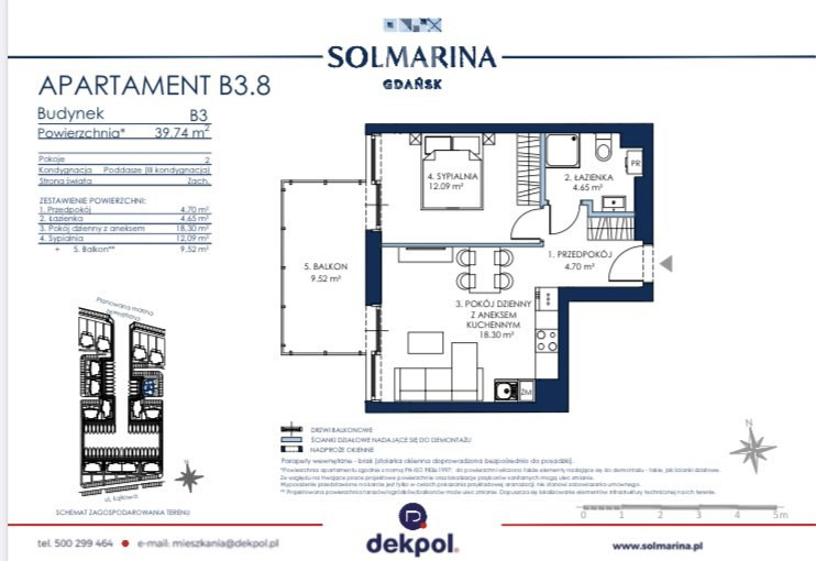 Apartament o powierzchni 39, 74 m2 położony na trzecim - najwyższym piętrze budynku B3-8 będącym częścią wyjątkowej inwestycji Sol Marina, gdzie Świat żagli miesza się ze światem nieruchomości premium . Apartament składa się z: